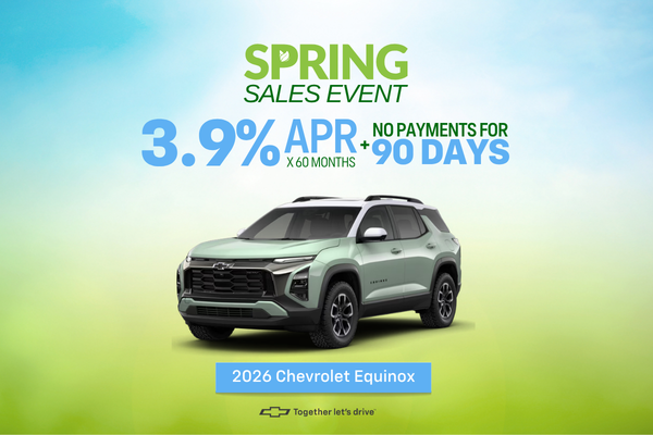 3.9% APR for 60 months. Finance charges accrue from date of financing. Deferred monthly payments for 90 days. Monthly payment is $18.37 for every $1,000 you finance. Example down payment: 16.8%. Must finance with GM Financial. Not available in PA. Some customers may not qualify. Not available with lease and some other offers. Take new retail delivery 4/30/26.