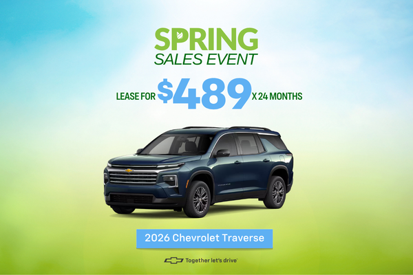 Example based on national average selling vehicle price. Each dealer sets own price. $489/month for 24 months. Your payments may vary. Payments are for a 2026 CHEVROLET Traverse FWD LT with an MSRP of $42,795. Based on due at signing amount of $7,993 (after all offers). 24 monthly payments total $11,736. Option to purchase at lease end for an amount to be determined at lease signing. Lessor must approve lease. Take new retail delivery by 04-30-2026. Lessee pays for maintenance, repair, excess wear and disposition fee of $395 or less at end of lease. No security deposit required. Payments may be higher in some states. Not available with other offers. **For Current GM Employees and Eligible Family Members who are Current Lessees of a 2021 model year or newer GM or Non-GM passenger car or truck at least 30 days prior to the lease of a new GM vehicle through GM Financial. Customer remains responsible for current lease payments. Each dealer sets own price. $489/month for 24 months. Your payments may vary. Payments are based on an MSRP of $42,795. Based on due at signing amount of $3,859 (after all offers). 24 monthly payments total $11,736. Must show proof of lease. Option to purchase at lease end for an amount to be determined at lease signing. Lessor must approve lease. Lessee pays for maintenance, repair, excess wear and disposition fee of $395 or less at end of lease. No security deposit required. Payments may be higher in some states. Not available with other offers. Take new retail delivery by 04-30-2026.